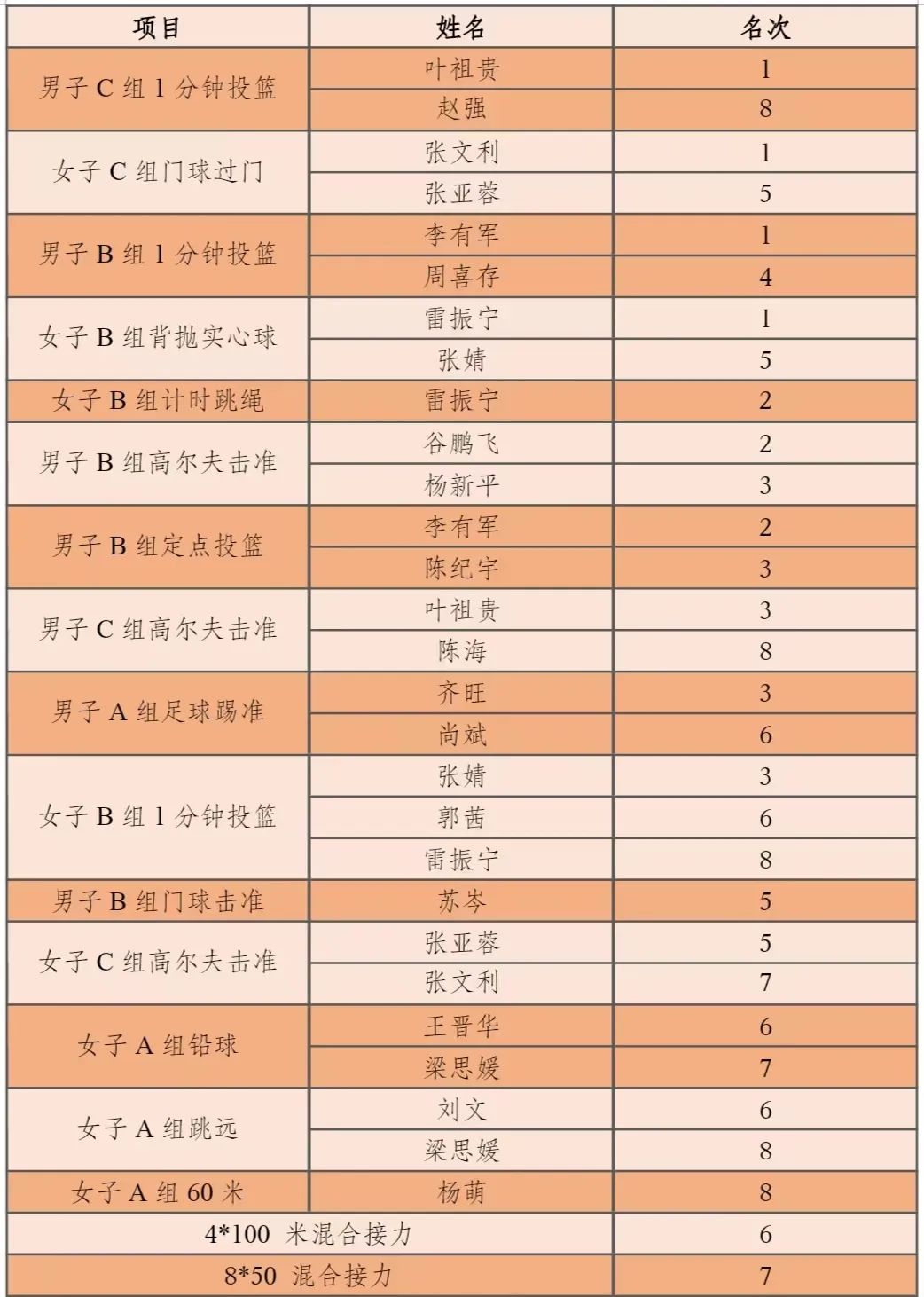 76net必赢官网教职工2024年体育文化节田径运动会成绩表