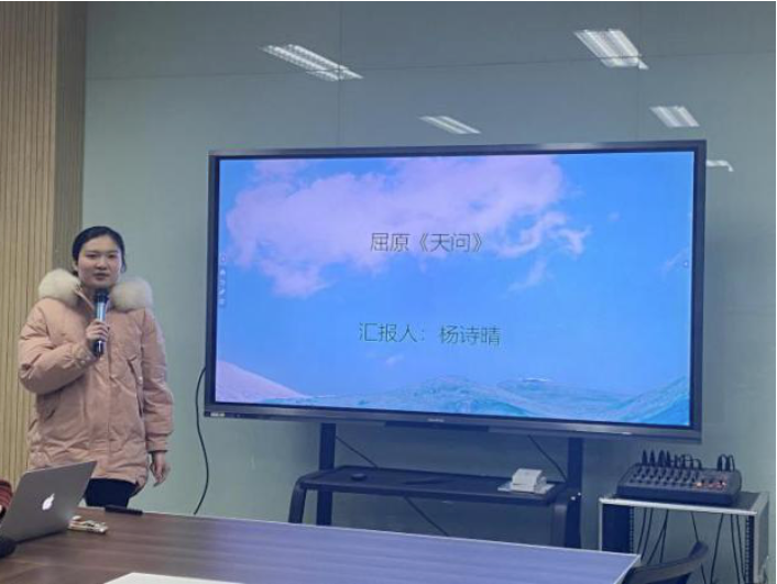 76net必赢官网的杨诗晴同学以屈原的《天问》为主题进行分享。她认为《天问》的诗歌内容问天地神灵何在,是将文学与物理学中的宇宙起源结合在一起的典范。政治失意后,屈子徘徊山泽,见楚之先王宗庙,其中壁画雕塑瑰丽奇伟,屈子深受感发写下《天问》,问天地之形成,人世之盛衰,后问楚国之现实政治。其中天地形成体现屈子之唯物主义思想与大胆怀疑之精神,在两千多年前的战国时期,闪耀着智慧之光。全诗以一曰字领起,全为问句,共有二百多问,可谓鸿篇巨制,这样一首长诗却能做到参差错落,生动奇崛,丝毫不显凝重呆板,其宏大的体制及惊人的想象力,令人赞叹与钦佩。