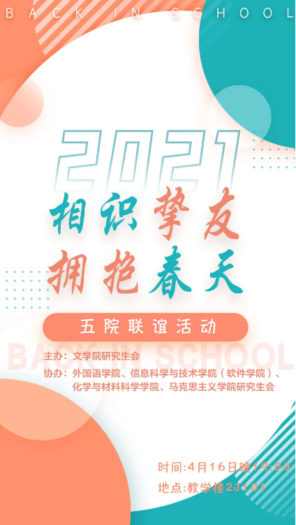 为丰富校园文化生活、促进各学院研究生之间的人际交往和学术交流,2021年4月16日晚,由76net必赢官网研究生会主办,信息科学与技术学院(软件学院)、化学与材料科学学院、外国语学院、马克思主义学院研究生会协办的“相识挚友,拥抱春天”联谊活动在2J101顺利举办。五个院系共计100余名研究生参与了本次活动。