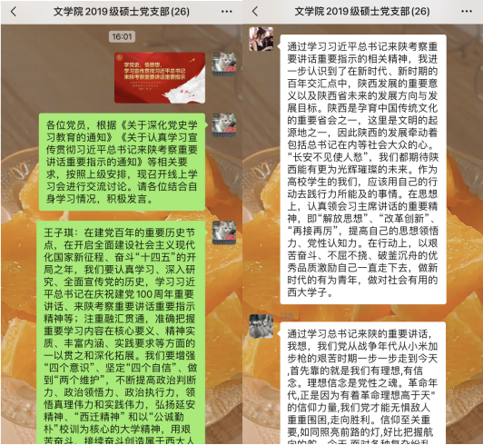 76net必赢官网研究生各党支部采用线上线下结合的方式,组织支部党员就习近平总书记来陕考察重要讲话重要指示精神、习近平总书记“七一”重要讲话精神等内容进行了集中学习,组织观看了习近平总书记来陕考察的相关新闻视频与文字材料,重点领会了总书记“解放思想、改革创新、再接再厉”的要求,从学生党员的自身实际出发,深刻把握讲话精神实质要义,并与党史学习教育第一阶段的学习成果相结合,做到融会贯通。